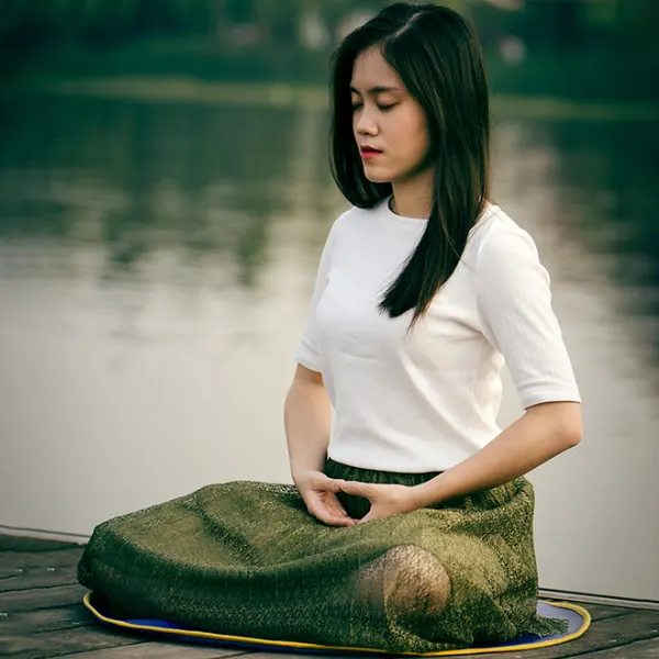 Place your hands on your lower belly. Eyes and mouth are closed.